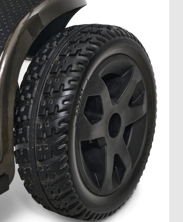 High-Profile Tires: Black, non-scuffing tires mounted on strong black rims for durability.