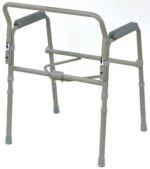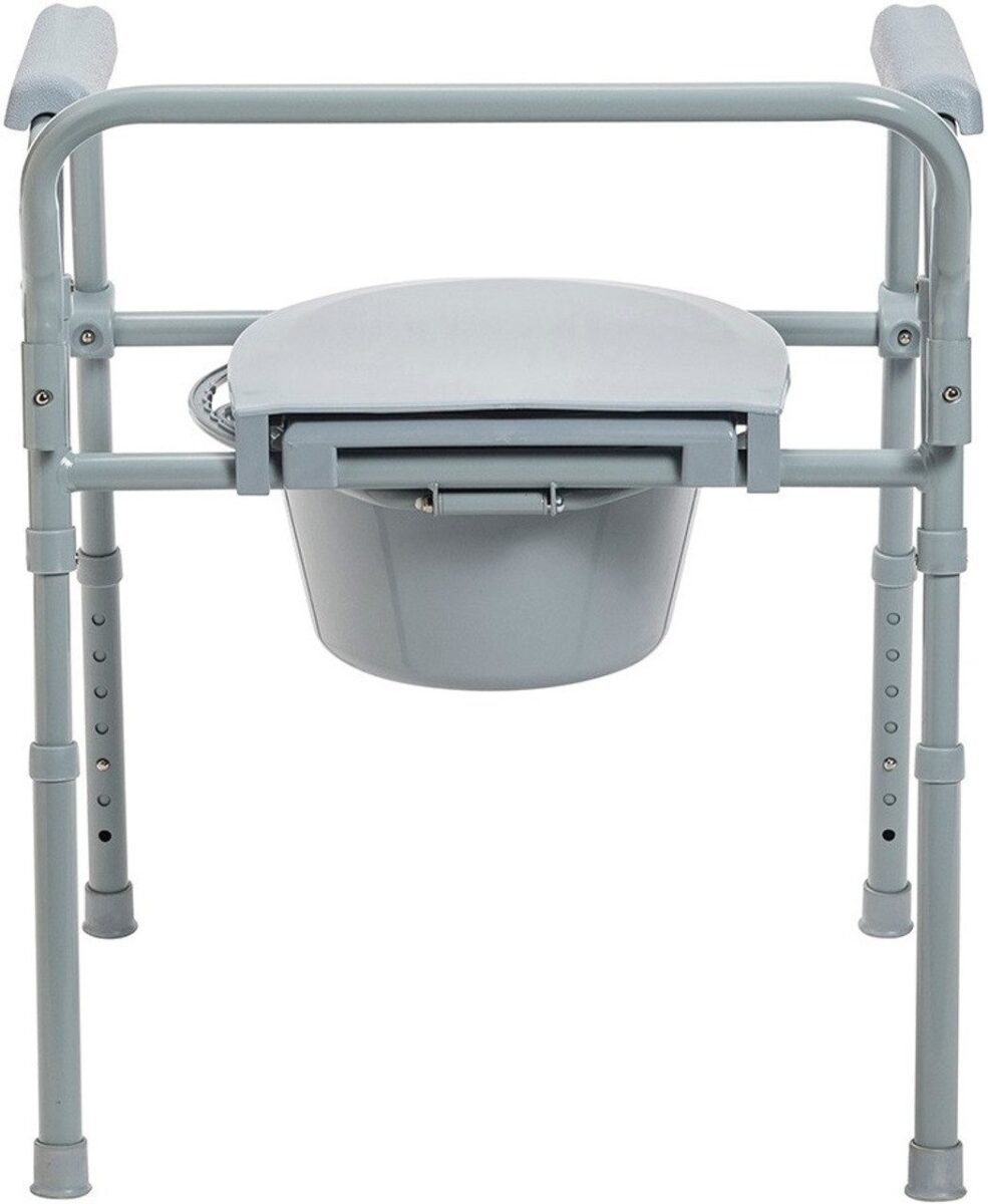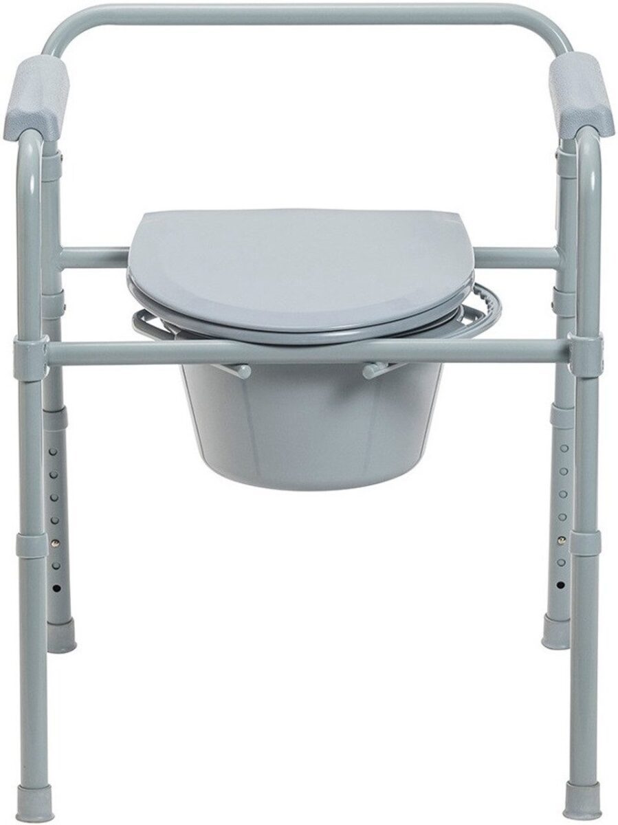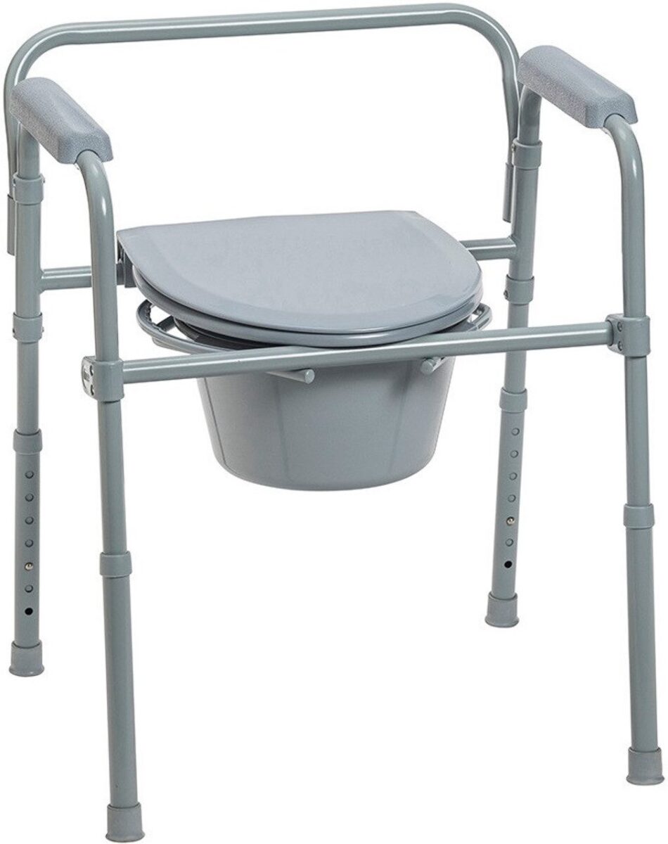 The Drive Folding Steel Commode is a versatile and convenient solution for those in need of a portable toileting option. This commode easily opens and folds flat, making it perfect for storage and transportation. It features a durable plastic snap-on seat and lid, a sturdy steel-welded construction with a grey powder-coated finish, and plastic arms for added comfort. The commode includes an 8 qt bucket with a carry handle, cover, and splash shield for added convenience.