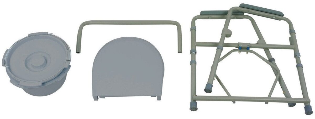 Includes Bucket: 8 qt commode bucket with carry handle, cover, and splash shield.