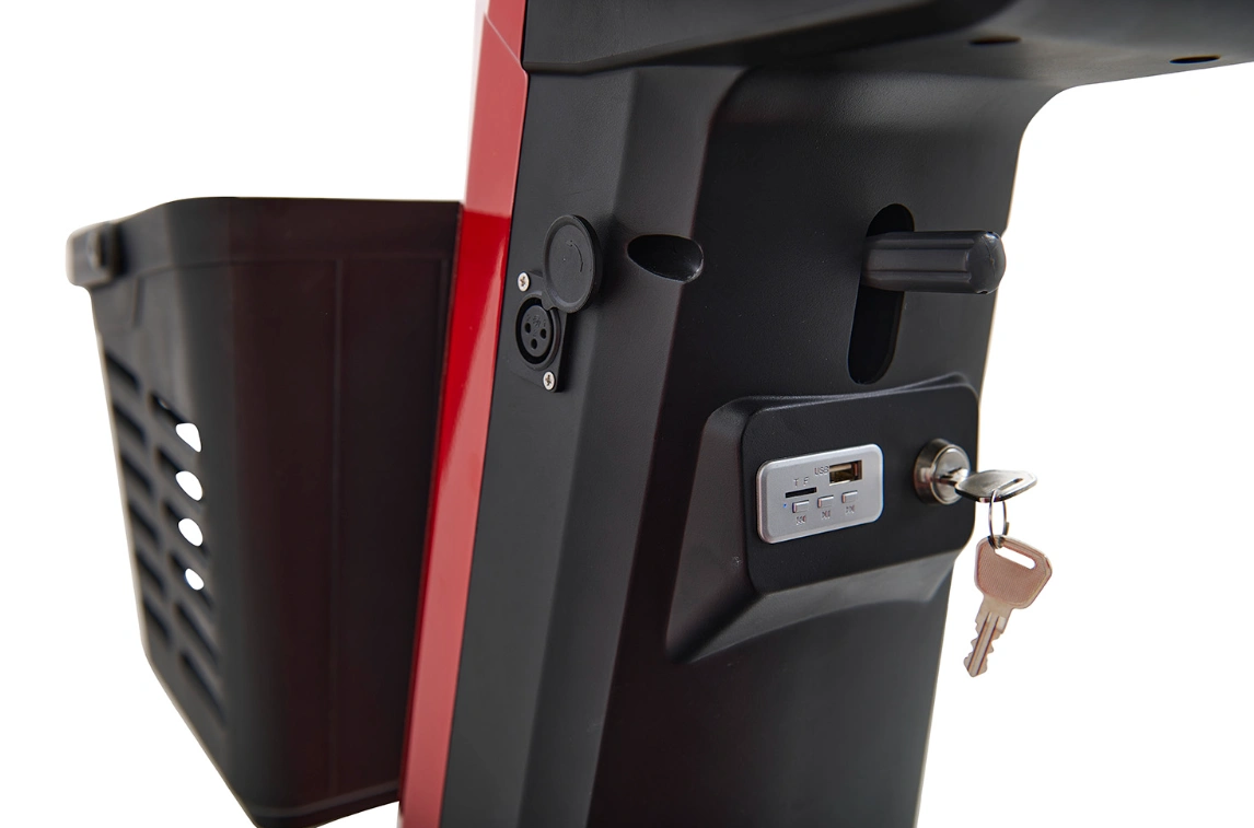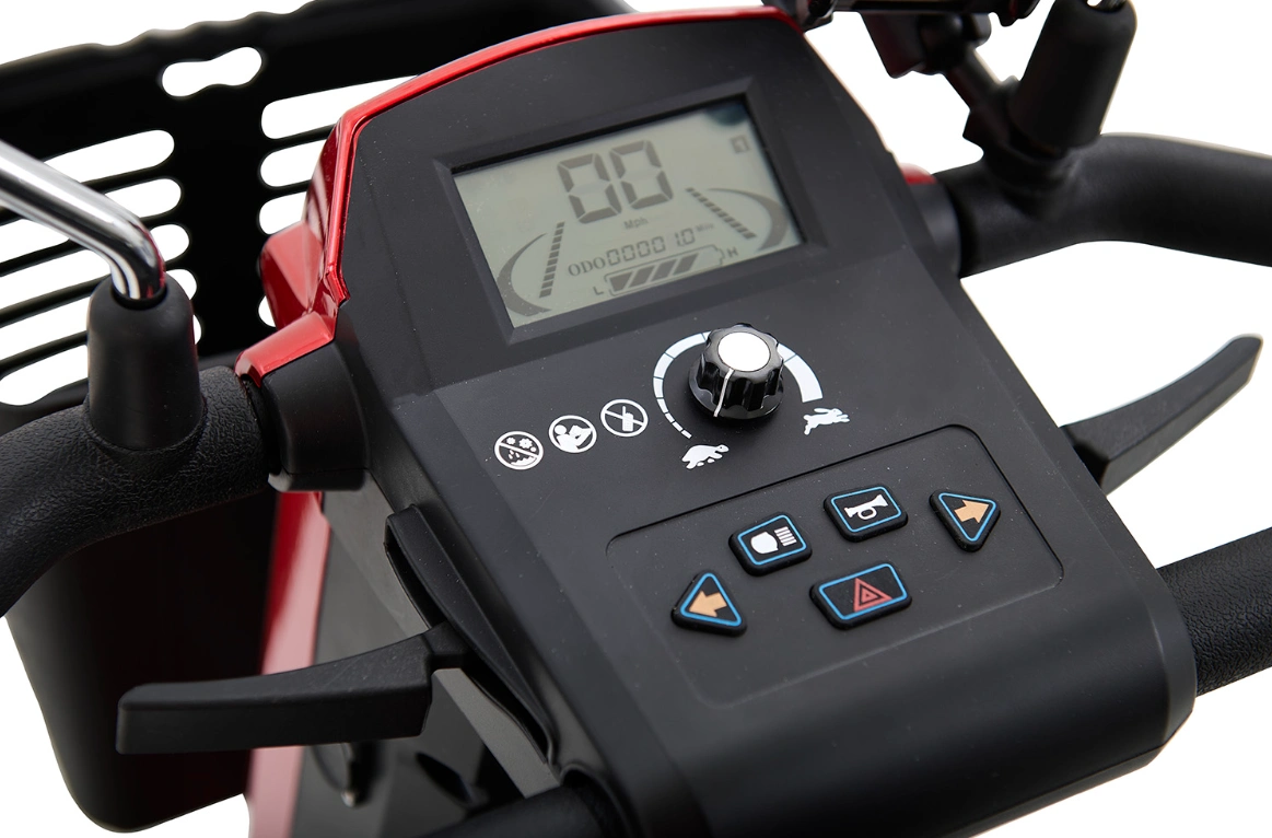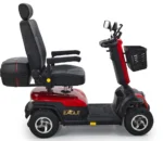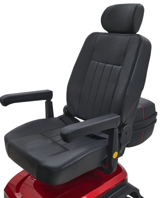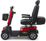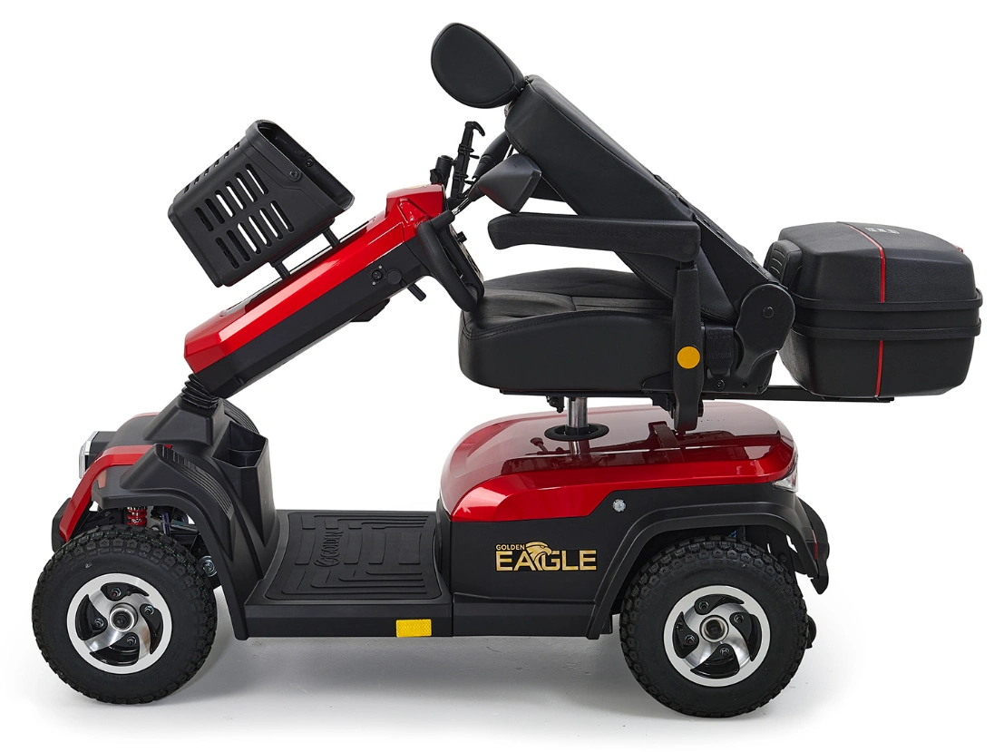Designed with a 500 lb weight capacity, the Golden Eagle is equipped with 13” pneumatic tires that offer superior traction and stability. The luxury high-back Captain’s seat with limited recline functionality ensures maximum comfort during extended use. For added convenience, the scooter includes a lockable, water-resistant storage compartment, built-in speaker with Bluetooth® and USB connectivity, rearview mirrors, a cell phone holder, and USB charger. Available in three vibrant color options—Red, Desert Tan, and Stone Grey—the Golden Eagle combines practicality with a sporty, rugged look.