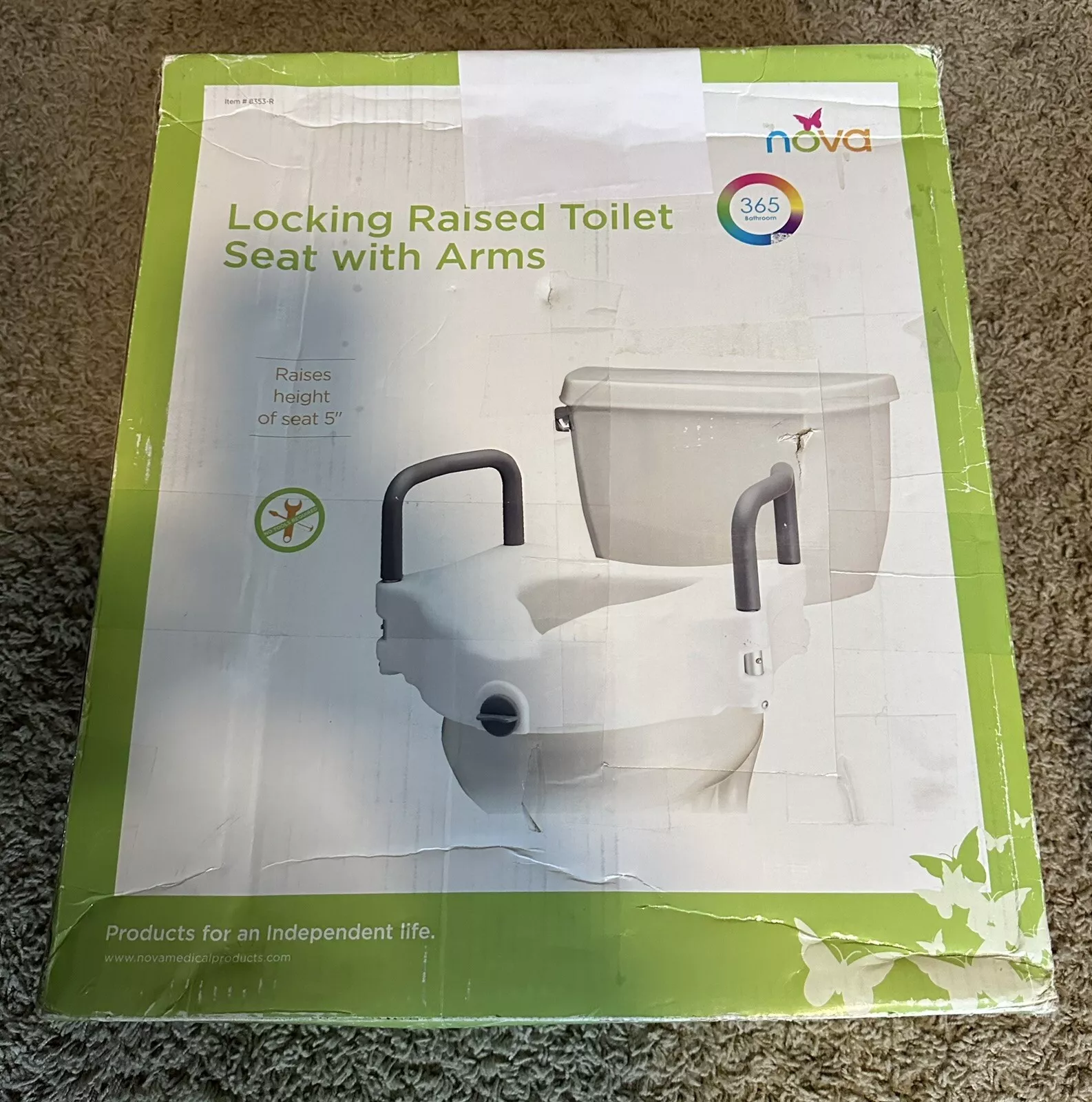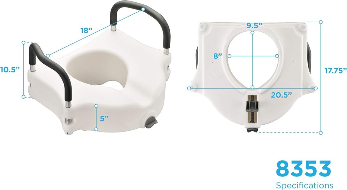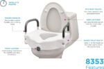 The NOVA Raised Toilet Seat with Arms (8353-R) is designed to assist individuals in safely getting on and off the toilet. It adds 5 inches of height to the toilet, providing additional leverage and support. The seat features padded arms for extra comfort and a front locking mechanism that easily adjusts to fit most standard and elongated toilets.